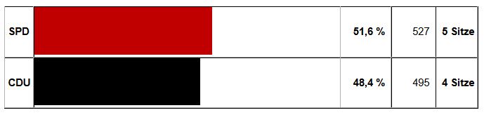 SPD: 506 Stimmen x 9 zu vergebene Sitze : 1043 Stimmen insgesamt = 4,4 ~ rund 4 Sitze